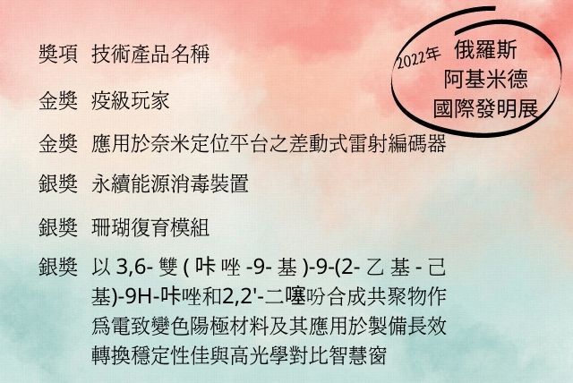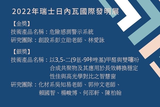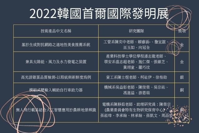 雲科大榮獲第18屆「技職之光」獎項機械系張軒誠同學榮獲技職傑出獎發明獎達人,會計系呂建鋐同學榮獲技職傑出獎證照達人,機器人技優專班林靖展同學榮獲技職傑出獎證照達人(技術型高中組)。 | 周榮泉教授獲頒星雲教育獎電子系周榮泉教授榮獲2022年第十屆星雲教育獎《典範教師獎》 | 2022韓國首爾國際發明展成果豐碩榮獲2金1銀2銅 | 榮獲2022「教育類國家永續發展獎」該獎項為搜集本校5年內於教學研究、產學計畫、校務治理等各項的執行績效進行綜合評選,委員對於本校表現給予高度肯定。 | 榮獲台灣企業永續學院「2022永續教學實踐與成果競賽」獎項永續通識課程—社會造夢者榮獲第三名。 | 徐啟銘教授獲111年傑出工程教授奬環安系徐啟銘教授榮獲中國工程師學會【111年度傑出工程教授奬】 | 榮獲2022年全球暨台灣企業永續獎GCSA榮獲永續報告書獎;TCSA台灣企業永續獎榮獲台灣永續典範大學獎、大學永續報告書白金級、英文報告書銅級、社會共融領袖獎。 | 2023 THE世界大學排名,雲科大首次入榜世界千大英國「泰晤士高等教育」於111年10月12日公布2023年世界大學排名,台灣共有11所大學進入世界千大,雲科大名列全球601-800名,國內第7名。 | 邱上嘉教授榮獲「國家產學大師獎」邱上嘉教授是首位榮獲教育部「國家產學大師獎」人文、設計、藝術領域的獲獎者。 | 2022台灣創新技術博覽會獲2銀2022台灣創新技術博覽會獲2銀。 | 2022波蘭華沙國際發明展奪佳績榮獲3金1銀。 | 2022年澳門國際創新發明展成績亮眼榮獲3金2銀2特別獎。 | 2022年烏克蘭國際發明展成績輝煌雲科大榮獲4金3銀。 | 視傳系榮獲2022德國紅點品牌暨傳達設計獎 Winner得獎作品分別為「質因子實驗室」與「海派出所」。 | 數媒系榮獲德國紅點競賽獎榮獲3項Red Dot:Winner佳績 | 勤誠/新代盃智慧機器人雲科大奪冠機械系參賽團隊「眼明手快」於五角聯盟智慧機器人產學研習營奪冠,榮獲團隊獎學金新台幣100,000元整。 | 雲科大橫掃亞太永續行動博覽會10項榮耀「APSAA亞太行動獎」獲得一金一銀一銅;「TSAA臺灣永續行動獎」獲得六銀一銅。 | 2022世界大學學術排名 雲科大名列科大第一 在台排名第11全球參與排名的大學共計超過2,500所,台灣有14所大學登上ARWU排名。 | 李傳房、徐啟銘兩位教授榮獲教育部師鐸獎設計學研究所李傳房教授(左)與環境與安全衛生工程系徐啟銘教授(右)榮獲教育部師鐸獎殊榮。 | 視傳系勇奪2022年德國iF設計新秀獎得獎作品分別為「海派出所」與「囀機」。 | 2022亞洲地區最佳大學排名,雲科大在台排名第十二名,科大第二該排名以論文引用、產學收入、國際視野、研究與教學等五大分項指標表現做排名,雲科大在「產學收入」得分是臺灣第六名,「研究」得分是臺灣第十一名,成績斐然。 | 2022年馬來西亞國際發明展獲2銀獲獎作品為「健康檢測廚具系統」及「六自由度雷射干涉儀檢測模組」。 | 雲科大勇闖2022紐約ADC獎為國爭光雲科大首次參賽一舉拿下1金獎1優勝的大好成績,並在「Young Ones Student Awards」全球大學排名榮獲〝全球並列第26名〞(為全國第一)。 | 2022世界大學影響力雲科名列科大第一世界大學影響力排名以SDGs為評比依據,在全台共45所入榜學校中,雲科大排名第四,科技大學第一。 | 全國學生社團評選獲獎111年全國大專校院學生社團評選暨觀摩活動,會計系學會榮獲特優,紅筠攜手社榮獲優等。 | 2022年日本創新發明展獲佳績「日本東京創新天才國際發明展」勇奪10金4銀。 | 2022年俄羅斯國際發明展成績亮眼阿基米德國際發明展榮獲2金3銀 | 2022年瑞士國際發明展獲佳績日內瓦國際發明展榮獲1金1銀 | 本校榮獲《遠見》USR大學社會責任獎計畫方案「雲林養雞產業溯源供應鏈之建置與永續營運」榮獲產業共創組楷模獎。 |