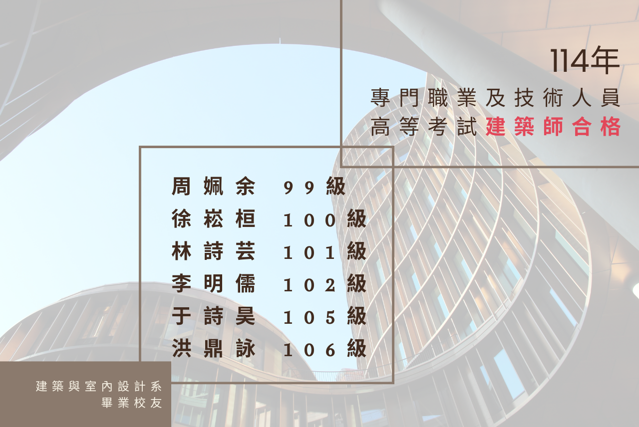 建築與室內設計系校友通過114年專門職業及技術人員高等考試建築師合格。