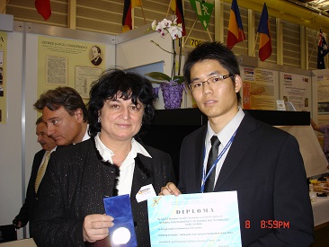 2011瑞士日內瓦國際發明展-可於大氣環境下接合陶瓷金屬之低溫軟銲填料獲頒羅馬尼亞別獎(右者為電子系陳建呈博士生) |